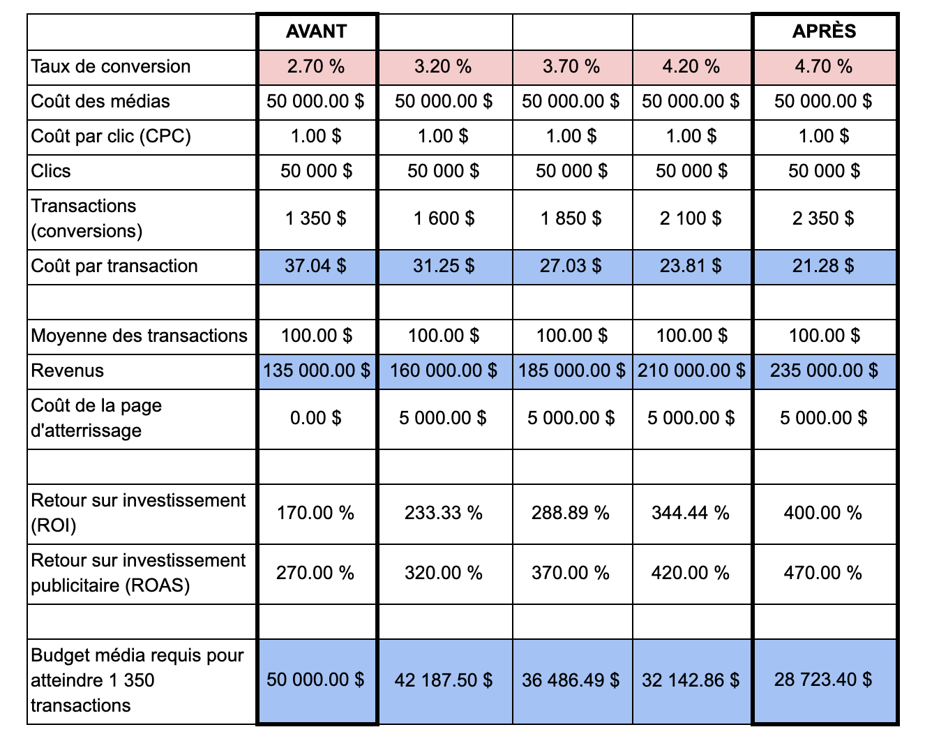 If we look at the following table, we can see that a tiny incremental increase in the conversion rate (by 0.5%) can have a profound impact on both the cost per transaction and the revenue.