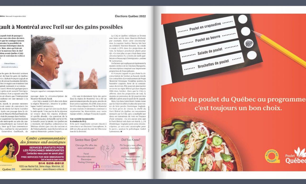 “The elections are the time to share ideas and values from Québec,” she says. “We took the opportunity to highlight the local identity of Les Éleveurs de volailles du Québec at a time when people are most receptive, which is in line with our goal to inspire residents to buy local.”