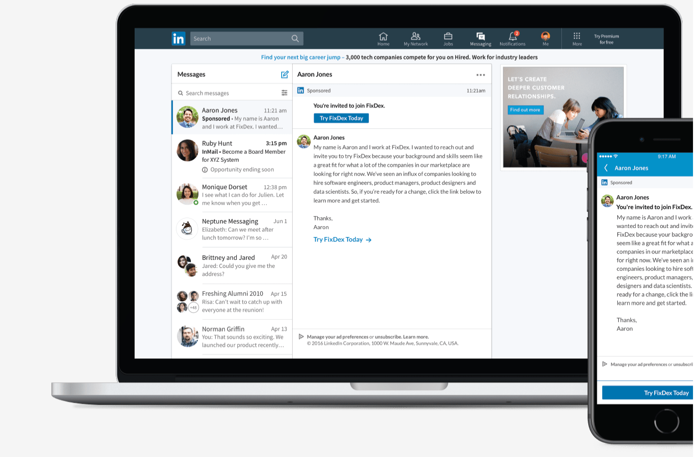 Il existe deux options de messages sponsorisés. D’abord, vous pouvez décider d’envoyer ce que LinkedIn nomme des Message Ads (Connu sous l’ancien nom Sponsored InMail). Ce sont ces annonces qui se retrouvent directement dans la messagerie de l’audience.