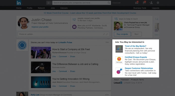 Les annonces textuelles de LinkedIn s’apparentent aux publicités générées par Google Ads. Celles-ci présentent à l’utilisateur un titre, un court texte et une image carrée de petite taille. Rapides à créer, elles s’affichent à la droite de l’écran de l’utilisateur, parmi d’autres annonces du même type.