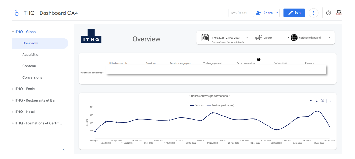 Afin de faciliter l’analyse des données pour ITHQ, profitant de la migration GA4, nous avons décidé de regrouper l’ensemble des rapports sous un même et unique tableau de bord GA4. Nous avons donc créé un tableau de bord unifiée pour l’ITHQ en intégrant seulement les données de GA4.