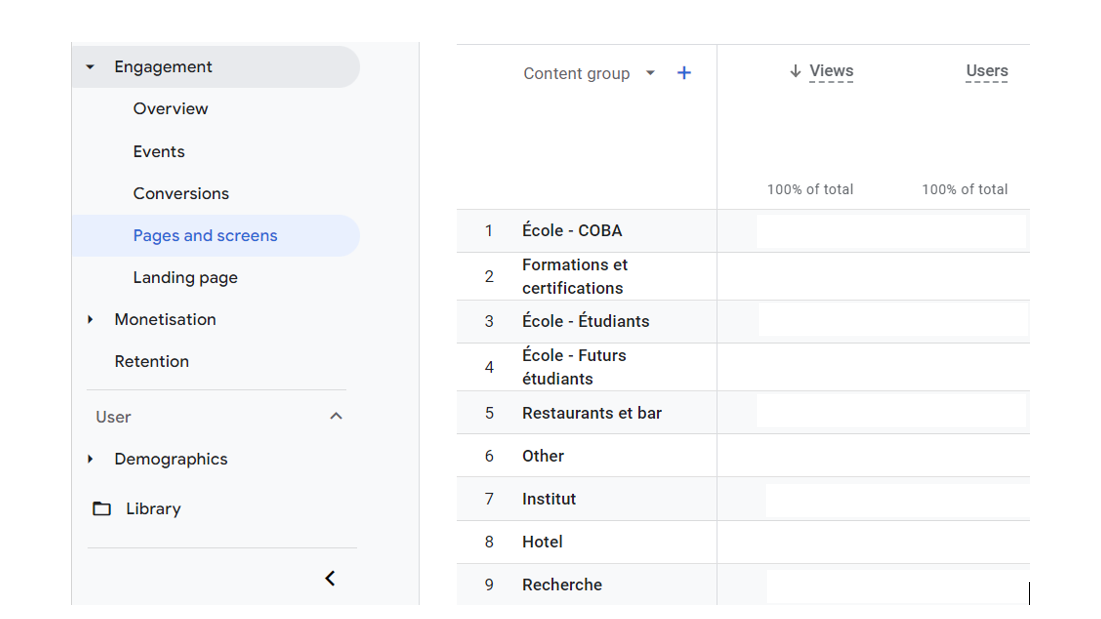 - Configuré une propriété GA4 globale unifiant toutes les entités de l’ITHQ avec la possibilité de filtrer les données par nom de domaine ou par activité avec la dimension personnalisée “content group »