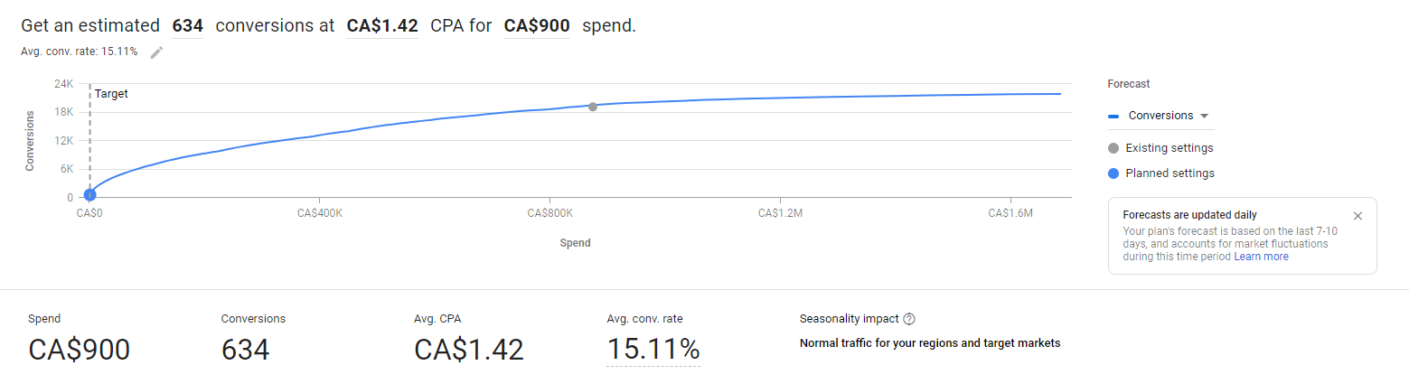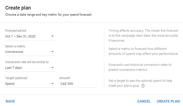 Le choix d’une cible pour le plan est une étape facultative, mais recommandée par Google. Elle permet à l’outil de mieux répartir les dépenses potentielles en fonction de l’objectif désiré. Par exemple, dans l’exemple ci-dessous, l’outil présentera le nombre de conversions possibles pour des dépenses de 900 $.