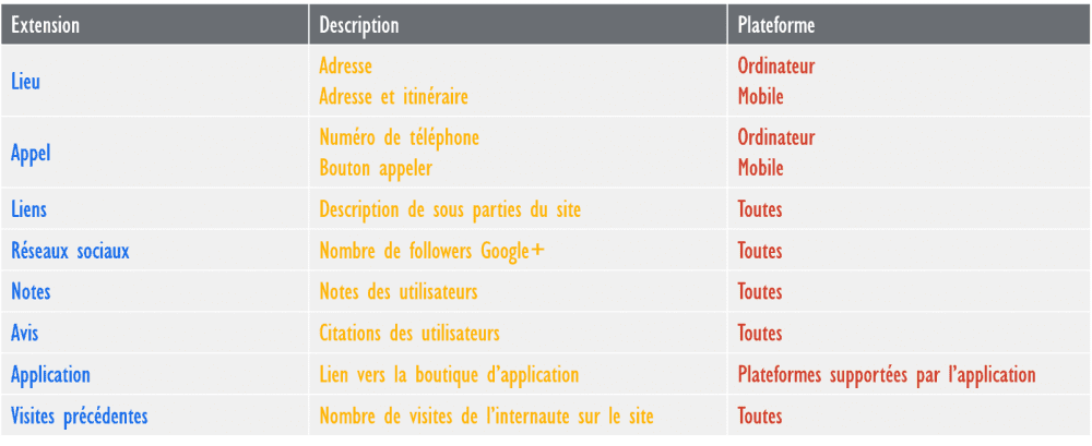 Les extensions Adwords – apparues avec les liens sitelinks en 2009 – se sont multipliées et offrent de plus en plus de possibilités. Elles permettent d’afficher de l’information complémentaire aux annonces. On peut ainsi – en plus de l’annonce classique – afficher des sous parties du site, le lieu, le numéro de téléphone, le compte Google+, les notes ou avis des consommateurs, un lien vers une application, les visites précédentes de l’utilisateur sur la page ainsi que les offres spéciales.