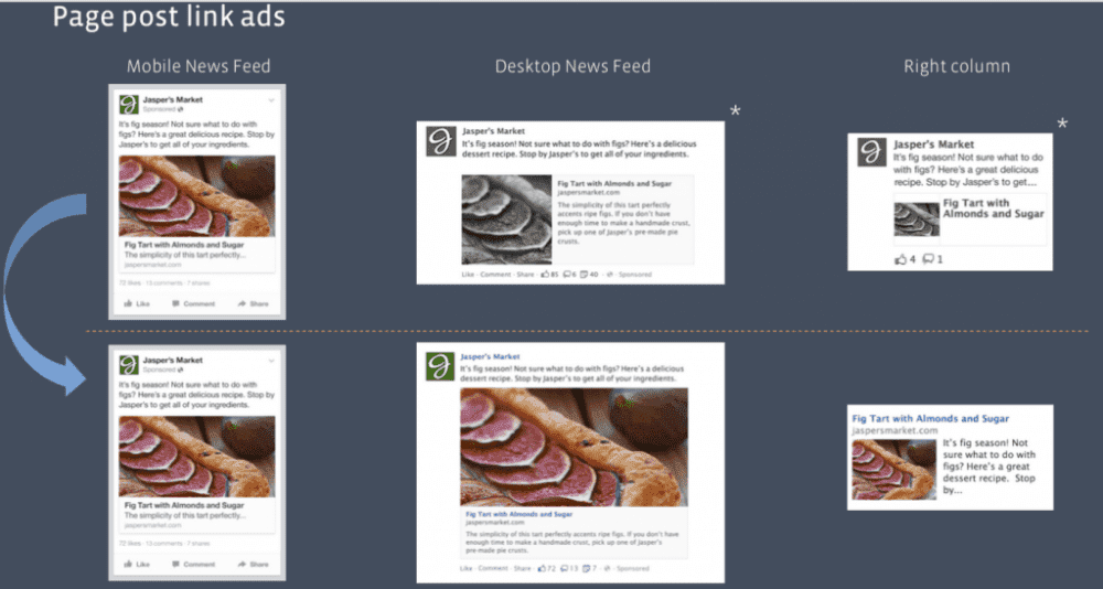 De manière générale, l’espace alloué aux images a été revu à la hausse pour la majorité des formats du News Feed et certains de la colonne de droite. On peut désormais utiliser des images faisant jusqu’à 1200×627 pixels (dans le cas des Sponsored Posts) ce qui permettra aux annonceurs d’avoir de grands visuels dans leur créatif (voir la différence avant/après ci-bas).Read More