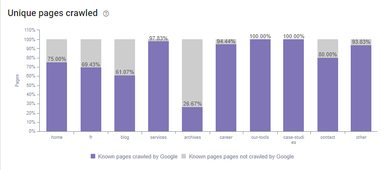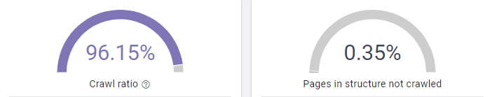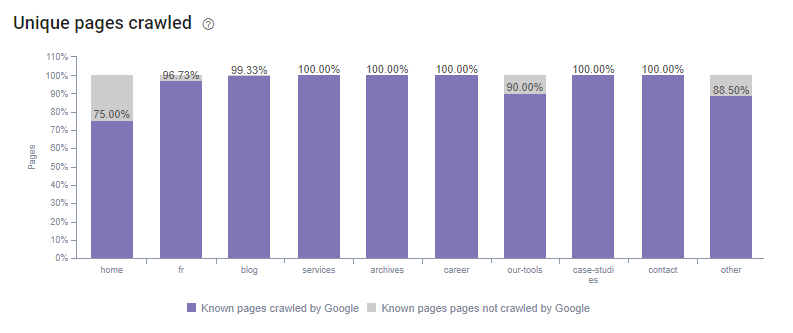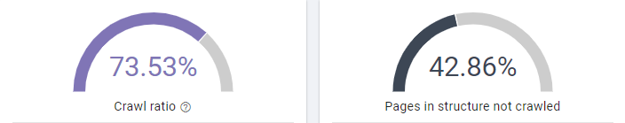 Cela se confirme lorsque l’on regarde le crawl ratio du site et qu’on le compare avec le précédent crawl ratio. Avant, le crawl ratio était de 73.5% ce qui signifie que 26.5% des pages du site Dialekta – connu par Google et Oncrawl – n’étaient pas crawlées par les Googlebots. De plus, 43% des pages présentes dans la structure du site n’étaient pas non plus crawlées.