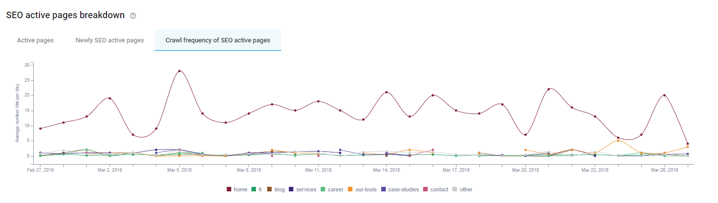 Cela se confirme sur le graphique ci-dessous, ou nous apercevons que parmi les pages actives SEO, seule la page d’accueil (répertoire Home) est crawlée fréquemment (+ de 5 hits par jour).